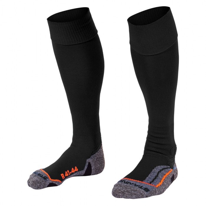 For both football and hockey, the Uni Pro Socks are ideal. The socks have a double elastic border, a protective impact zone around the ankle and a knitted mesh structure on the back. The socks provide optimal moisture regulation during the game. Due to the high stretch level and the anatomical foot, the socks fit nicely. The socks are made of recycled polyester and have a left-right indication and antibacterial finish in the sole.